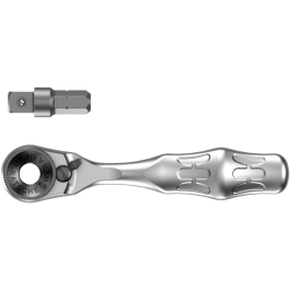 De Wera bit-ratel. Eenvoudig te bedienen, zelfs met 1 hand op lastige schroeflocaties. Smeedijzeren uitvoering. Fijnvertand mechaniek (60 tanden) voor een kleine terughaalhoek van 6° voor nauwkeurig werken. Het geribde wieltje maakt snel schroeven op lastige schroeflocaties mogelijk, als geen ratel kan worden gebruikt. Eenvoudige links/rechts-omschakeling. Ergonomisch -hendel. Voor 1/4" bit- en dopopname.