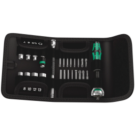 Ratelen en schroeven in Kraftform Kompakt-formaat. Inclusief Zyklop-ratel: ongelooflijk hoge schroefsnelheid. Combineert 5 rateltypes in een enkele ratel. Rotatiemassaconstructie en sneldraaibus met goede grip voor snel werken Vrij zwenkbare ratelkop; met vaste standen bij 0° en 90° naar links en rechts alsmede 15° vanuit 90° naar binnen; in 0° stand te gebruiken als conventionele schroevendraaier. Eenvoudig drukknopontgrendeling; links/rechts-omschakeling, fijn vertand; geringe terughaalhoek van 5°. Meerdelige Kraftform- handgreep voor vermoeiingsvrij werken. 26-delig in vouwetui voor bevestiging aan de broekriem. 1 Zyklop-ratel met 1/4"-aandrijving, 7 Zyklop-doppen (metrisch), 1 Zyklop-verlengstuk (lang) met snelwisselfunctie, 1 verbindingselement, 16 bits met een lengte van 50 mm.