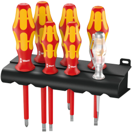 7-delige schroevendraaierset bestaande uit stuksgewijs geteste geïsoleerde schroevendraaiers voor veilig werken conform IEC 60900. Individueel getest bij 10.000 V voor veilig werken bij de toegelaten spanning van 1.000 V. Kraftform Plus-handgreep om prettig en ergonomisch verantwoord te kunnen werken en blaren en schuurplekken te voorkomen. Harde gripzones voor een hoge werksnelheid, zachte gripzones voor een hoge draaimomentoverdracht. Deels voorzien van Lasertip: De punt grijpt zich vast in de schroefkop en voorkomt wegglijden. Met Take it easy tool finder: Kleurcodering op profiel en maatcode. Wegrolbescherming verhindert telkens wegrollen op de werkplek. Inclusief eenpolige fasetester en 1 houder om het gereedschap op te kunnen bergen.