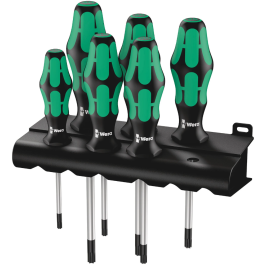 6-delige schroevendraaierset voor TORX® schroeven. Meerdelige Kraftform-handgreep voor snel en veilig werken. Kraftform Plus: Harde gripzones voor een hoge werksnelheid, zachte gripzones voor een hoge draaimomentoverdracht. De Wera Black Point-punt en een uitgebreide harding garanderen een lange gebruiksduur van de punt en zorgen voor extra corrosiebescherming en een hoge pasnauwkeurigheid. Met "Take it easy" toolfinder": Kleurcodering op profiel en maatcode. Zeskantige wegrolbescherming verhindert telkens wegrollen op de werkplek. Wordt geleverd met handig rack waarin de schroevendraaiers overzichtelijk kunnen worden opgeborgen.